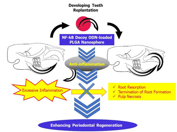 IMAGE: EXCESSIVE INFLAMMATION AFTER TOOTH REPLANTATION INDUCES SEVERAL OMPLICATIONS INCLUDING ROOT RESORPTION, TERMINATION OF ROOT FORMATION AND PULP NECROSIS, CAUSED BY EXCESSIVE INFLAMMATION. NF-KB DECOY ODN-LOADED PLGA NANOSPHERE INHIBITS POST-OPERATIVE INFLAMMATION, THUS ENHANCES PERIODONTAL REGENERATION, INCLUDING REDUCTION OF ROOT RESORPTION, AND CONTINUATION OF ROOT FORMATION. view more