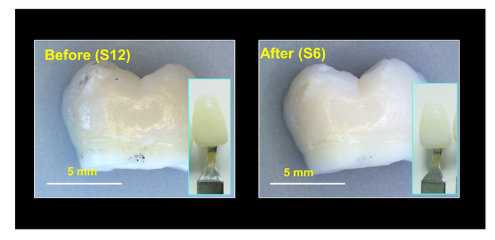 IMAGE: A NEW BLEACHING GEL WHITENED TOOTH SAMPLES BY SIX SHADES, USING A LOW LEVEL OF HYDROGEN PEROXIDE (12%). view more