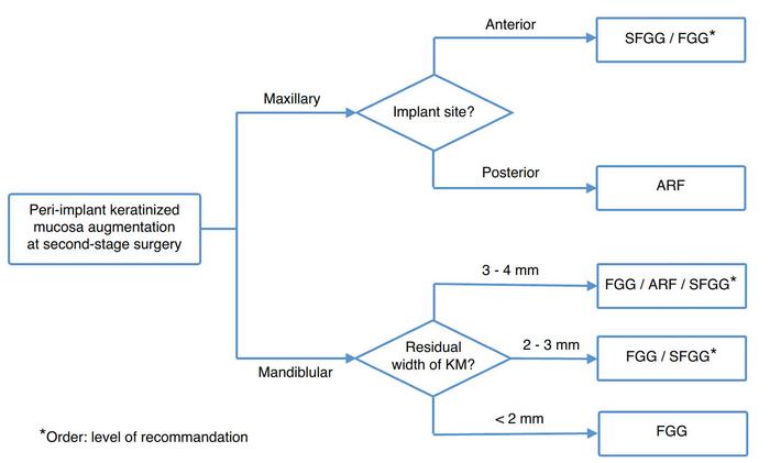 The consensus also introduces a decision tree to guide surgeons based on implant location, residual KM width, and patient preferences. For example, FGG is advised in cases with <2 mm of KM, especially in the lower jaw. ARF is suited for the upper back teeth, while aesthetic concerns in the front teeth call for SFGG with tissue substitutes. Factors such as gingival thickness, surgical experience, and cost are also considered. The result is a practical clinical tool for tailoring surgeries to individual needs, helping ensure both biological health and cosmetic satisfaction.