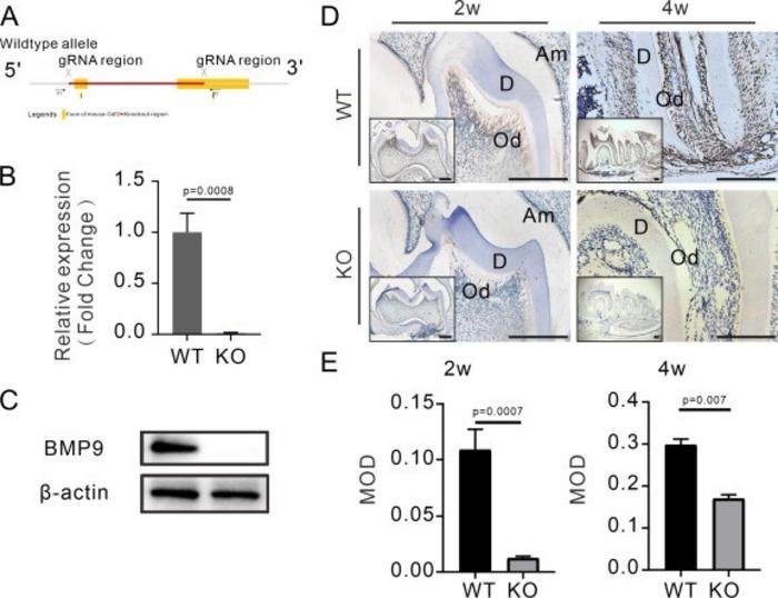 (A) Construction of the Bmp9-KO mice. (B) Relative expression of Bmp9 in the liver of 8-week-old wild-type (WT) littermates and Bmp9-KO mice by quantitative PCR in vitro (n ≥ 3). (C) Western blots of BMP9 and β-actin in the liver of 8-week-old WT littermates and Bmp9-KO mice (n = 6). (D) Immunohistochemical staining of BMP9 on sections of mandibular first molars from WT littermates and Bmp9-KO mice at 2 weeks and 4 weeks old (n = 7). The boxes shown are insets at a lower magnification. Am, ameloblasts; Od, odontoblasts; D, dentin. (E) Quantitative analysis of BMP9 expression. Scale bars = 200 μm.