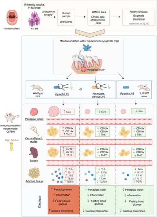 The researchers first analyzed periapical tissues from 94 endodontic surgery patients and found Pg to be a predominant pathogen, particularly in severe lesions. Vincent Blasco-Baque explains “To test causation and mechanism, we developed a controlled mouse model in which the endodontic space was monocolonized with Pg. Mice were placed on a high-fat diet to simulate metabolic stress and were assigned to receive either wild-type Pg with intact LPS, a weakened LPS strain, or purified LPS alone.” An additional group lacked IL-17 to determine its role in disease progression. Across all groups, the team evaluated periapical bone loss with micro-CT, profiled immune activation, and assessed adipose inflammation, dysbiosis, and glucose metabolism.