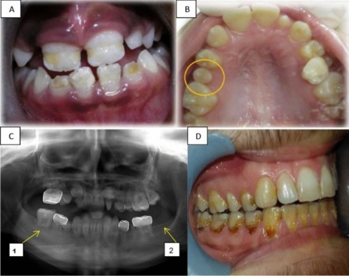 Abnormalities included missing or small teeth, root development and enamel structure damage, over-retention of primary teeth; impaction; premature eruption; decreased temporomandibular joint (TMJ) mobility; inability to open the mouth or jaw and facial deformities.