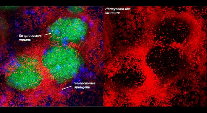 IMAGE: S. SPUTIGENA CELLS FORM A HONEYCOMB-LIKE STRUCTURE THAT ENCAPSULATES S. MUTANS TO GREATLY INCREASE AND CONCENNTRATE ACID PRODUCTION THAT BOOST CARIES DEVELOPMENT AND SEVERITY view more