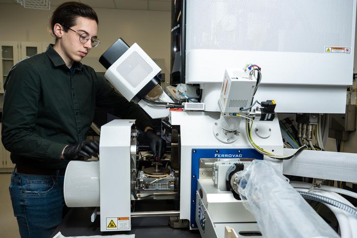 A research team at the University of Washington and the Pacific Northwest National Laboratory examined the atomic composition of enamel samples from two human teeth. The researchers found that samples from an older person contained higher levels of the ion fluoride. Shown here, Jack Grimm, UW doctoral student in materials science and engineering and a doctoral intern at PNNL, prepares an enamel sample for atom probe tomography by loading it into a plasma-focused, ion-beam scanning electron microscope.